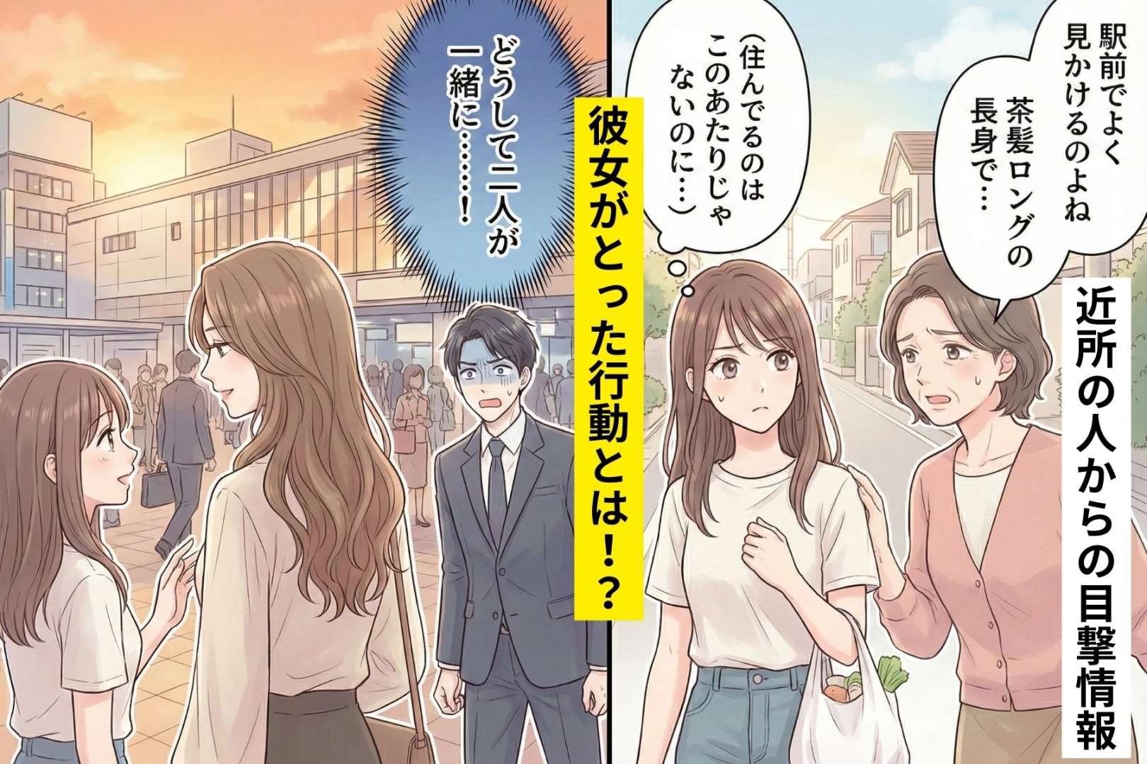 ある日の夕方、買い物帰りに近所の奥さんと立ち話をしていたときのこと。「そういえば、あなたの彼氏さんってこの辺りに住んでるの?」と聞かれました。彼は隣町のアパートに住んでいるので、私は首をかしげながら「いえ、少し離れたところですけど…」と答えたのです。すると奥さんは少し言いにくそうに、「最近、駅前でよく女性と一緒にいるのを見かけるのよね」と教えてくれました。