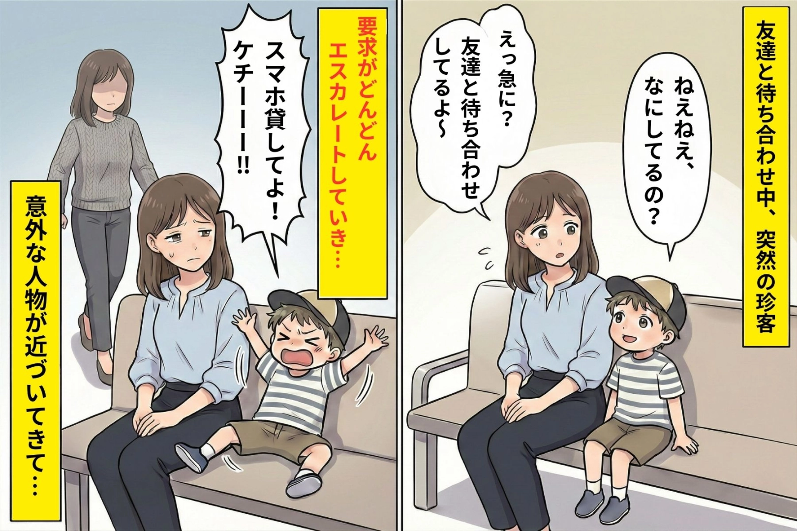 男の子の要求は次第にエスカレートしていきました。「お菓子ちょうだい」「スマホ貸して」と言い出し、断ると大きな声で「けちー!」と叫ぶのです。