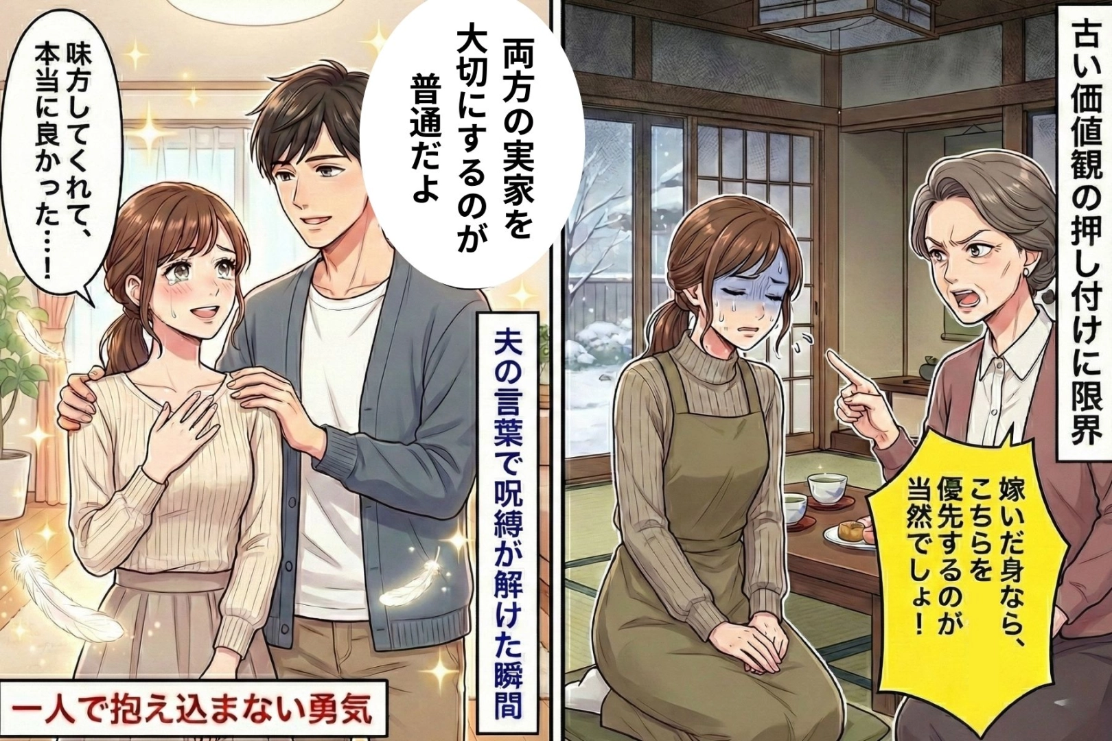 それからというもの、帰省のたびに同じやり取りが繰り返されるようになりました。義母は悪気があるわけではないのでしょう。ただ、昔ながらの価値観を大切にしているだけなのだと思います。けれど、私の実家の両親は何も言わずに待っていてくれていて、その優しさが逆に胸を締め付けました。