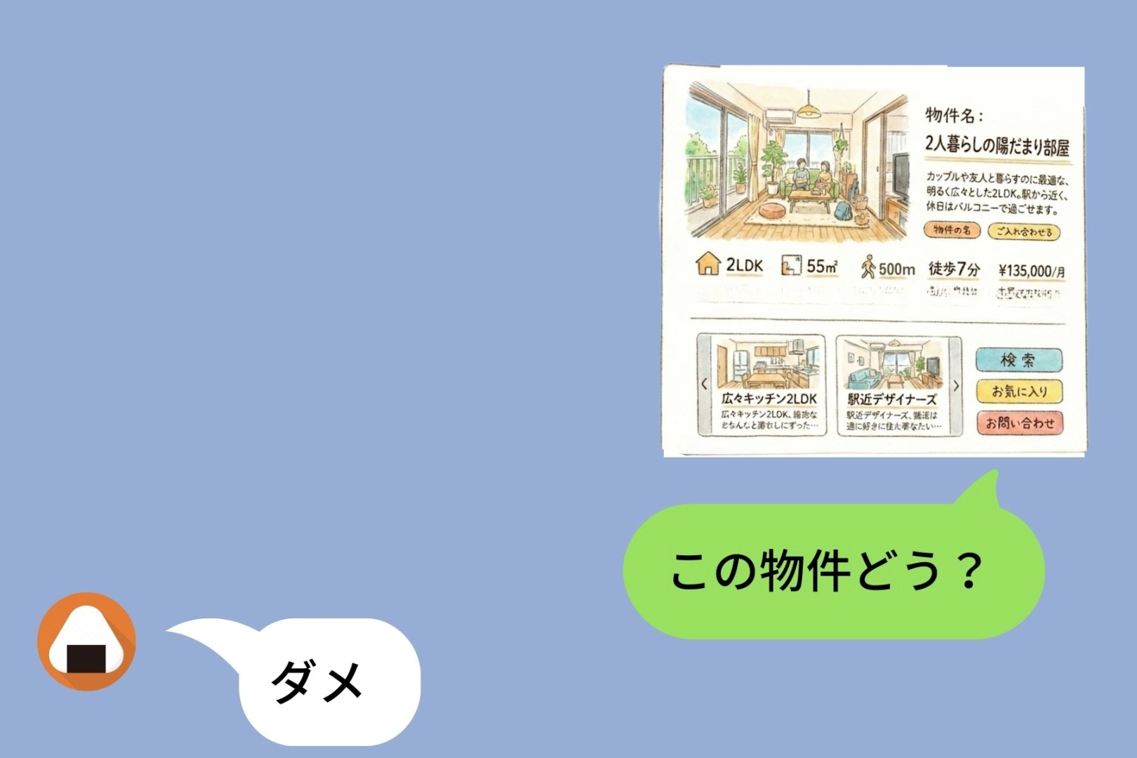 気を取り直して別の物件を送ると、また同じ反応が返ってきます。「ここは?駅近だよ」と送っても、「ダメ。もっと広いところがいい」と却下。ならばと少し広めの2DKを提案すると、今度は「家賃が高い」との返答でした。