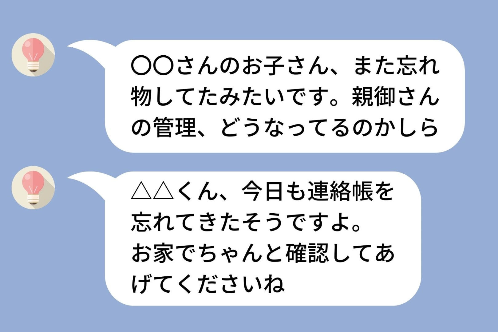 「〇〇さんのお子さん、また忘れ物してたみたいです。親御さんの管理、どうなってるのかしら」