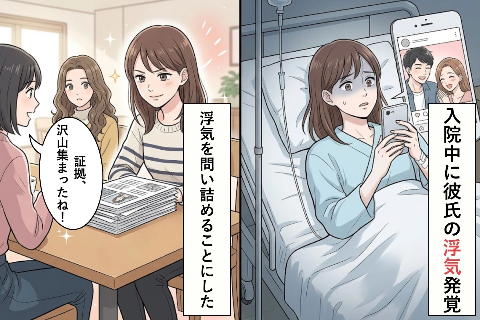 私が入院している間、彼は何食わぬ顔で遊び歩いていた。その事実を知ったとき、悲しみよりも「このままでは終われない」という思いが強くなりました。冷静に証拠を整理しつつ、浮気を問い詰める準備を進めてくれました。私一人では到底できなかったことを、二人が支えてくれたのです。