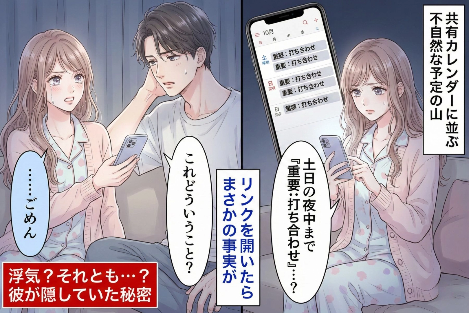 私たちは付き合い始めた頃から、彼の提案でお互いのスケジュールをカレンダーアプリで共有していました。休日の予定を合わせやすくするためです。ところがここ1ヶ月ほど、彼のカレンダーには「重要:打ち合わせ」という予定が急に増え始めたのです。平日の夜だけでなく、週末にも入っていることがありました。