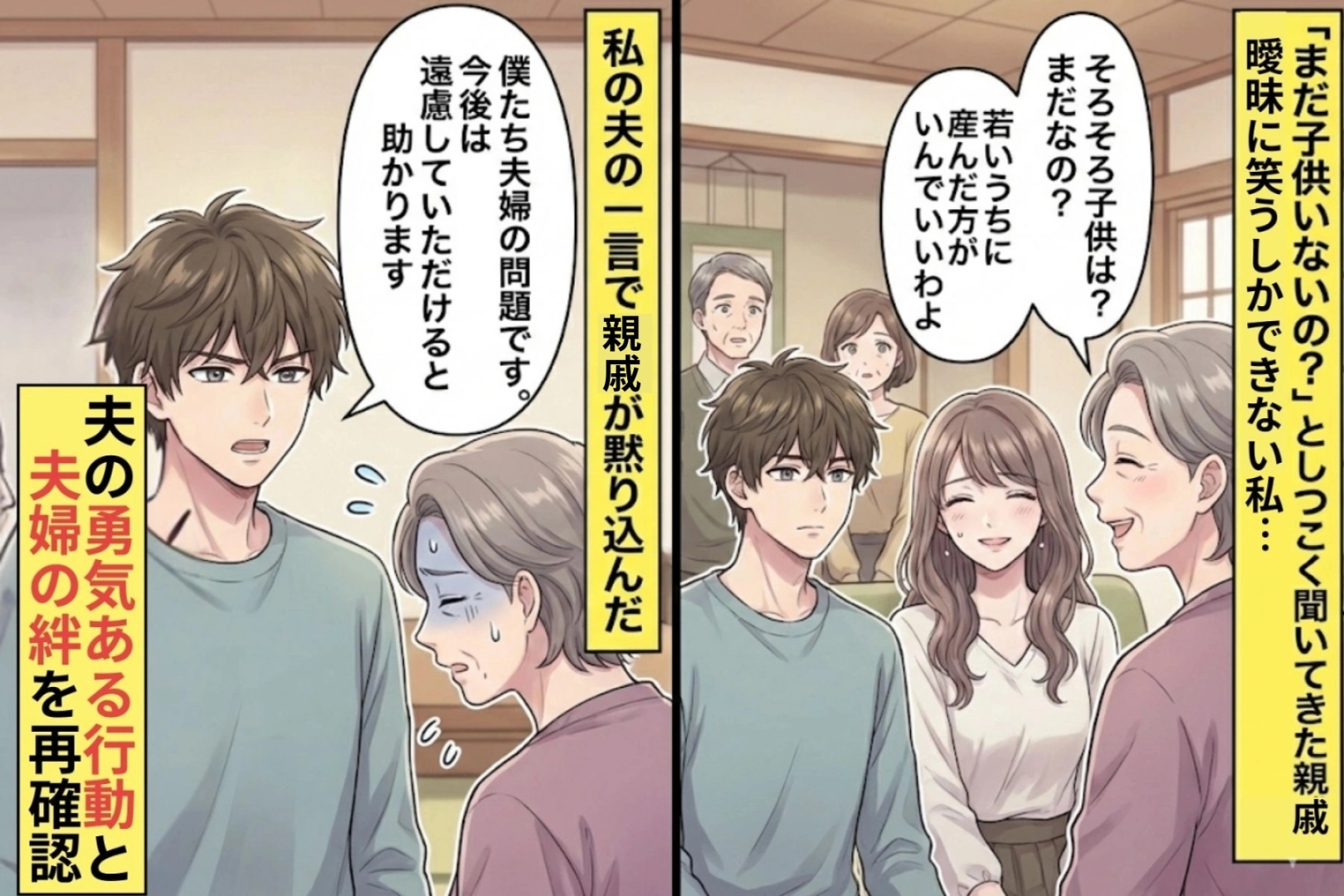 結婚して3年。親戚の集まりに参加するたびに、同じ質問を受けてきました。悪気がないのはわかっていても、そのたびに心がすり減っていく感覚がありました。けれどその日、隣にいた夫が発した静かな一言が、その場の空気を一変させたのです。