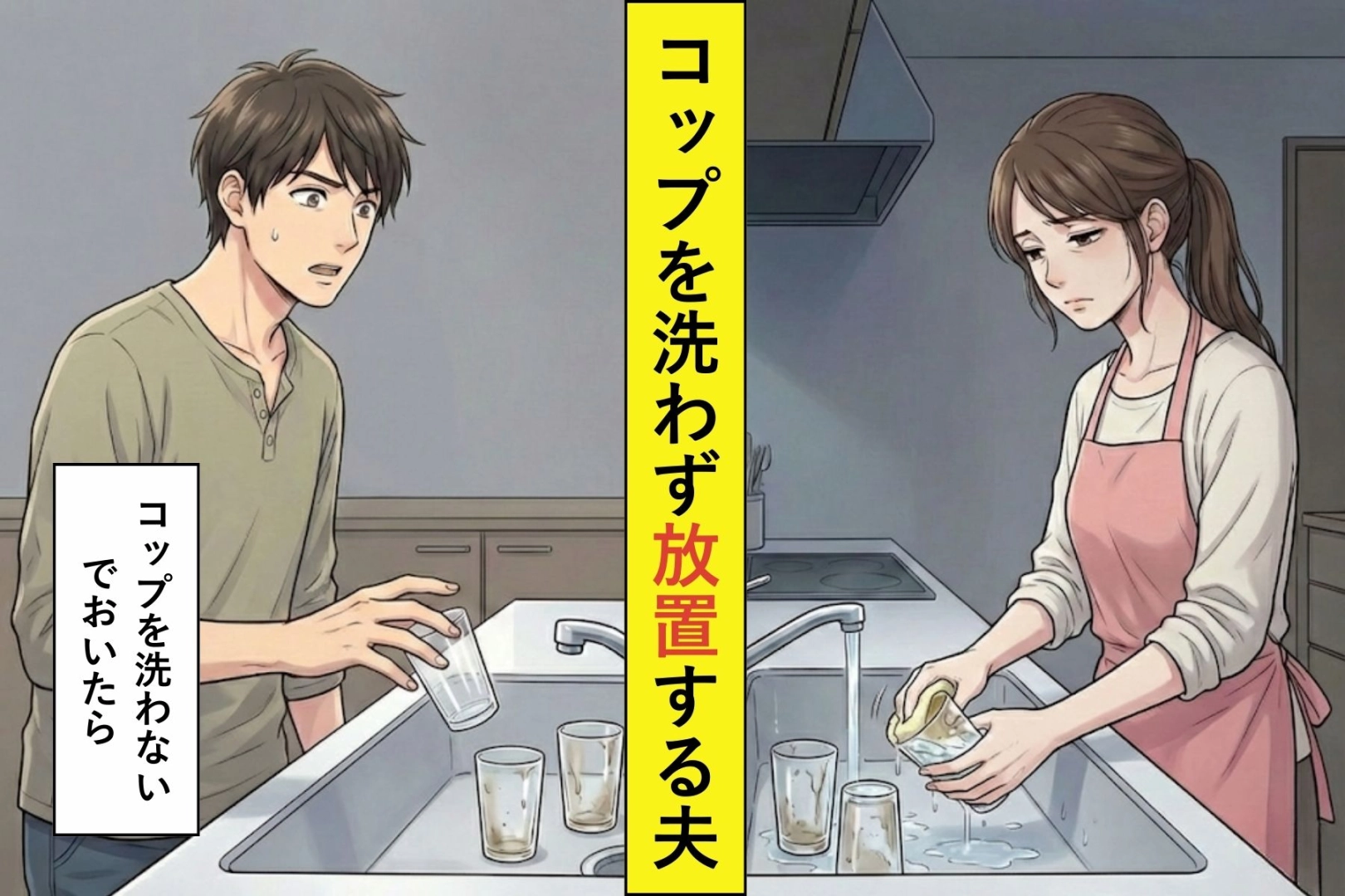 夫は決して悪い人ではありません。仕事も真面目にこなし、子どもたちのことも大切にしてくれる、そんな人です。ただひとつ、どうしても気になることがありました。使ったコップを、流しにそっと置くこと。「後で洗うから」と言いながら、その「後で」が来た試しがないのです。