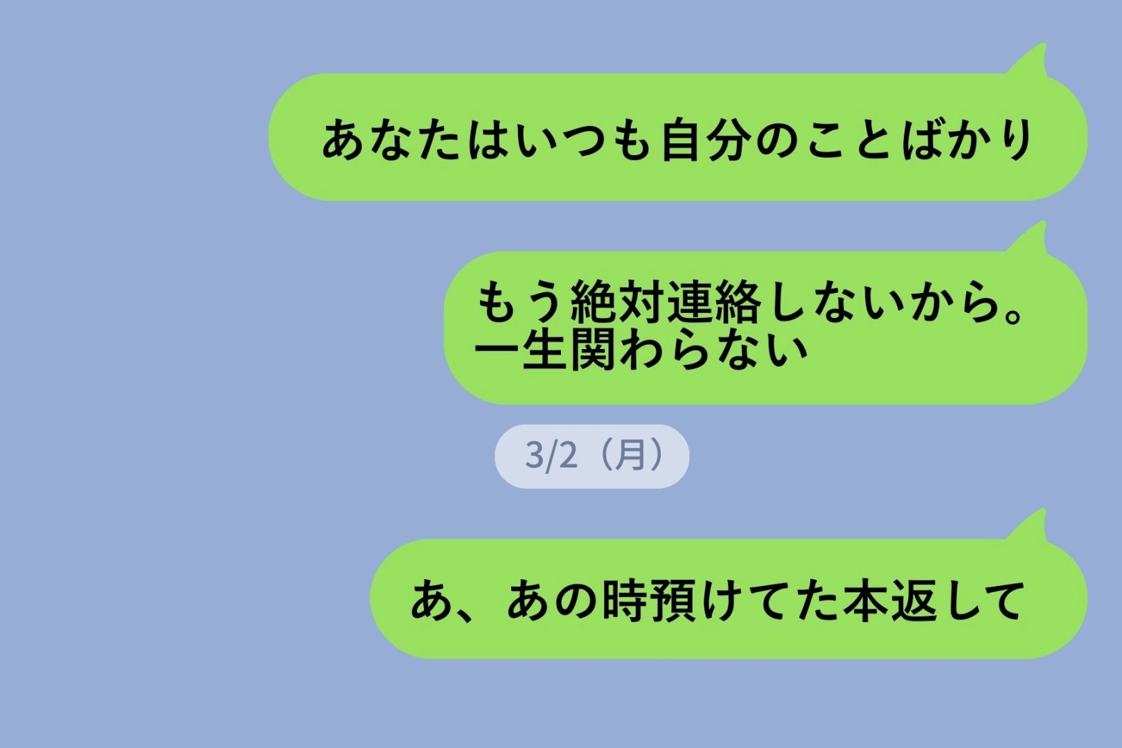 「絶対連絡しない」。そう送った夜から、スマホを何度も開いては閉じていました。でも、自分から「ごめん」とは言えない。絶縁はしたものの本心は連絡したくて、それで思いついたのが、3日後の朝に送った「あ、あの時預けてた本返して」でした。預けていた本。実はもう読み終わっていて、返してもらわなくても困りません。彼女から「わかった、送るね」とだけ返ってきたとき、胸がぎゅっと痛みました。