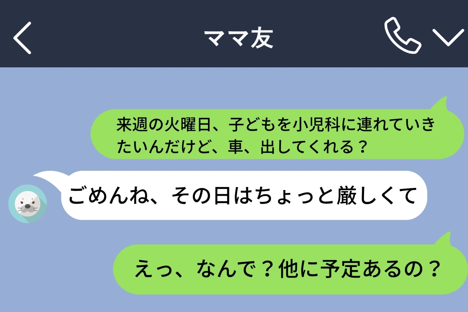 「来週の火曜日、子どもを小児科に連れていきたいんだけど、車、出してくれる?」