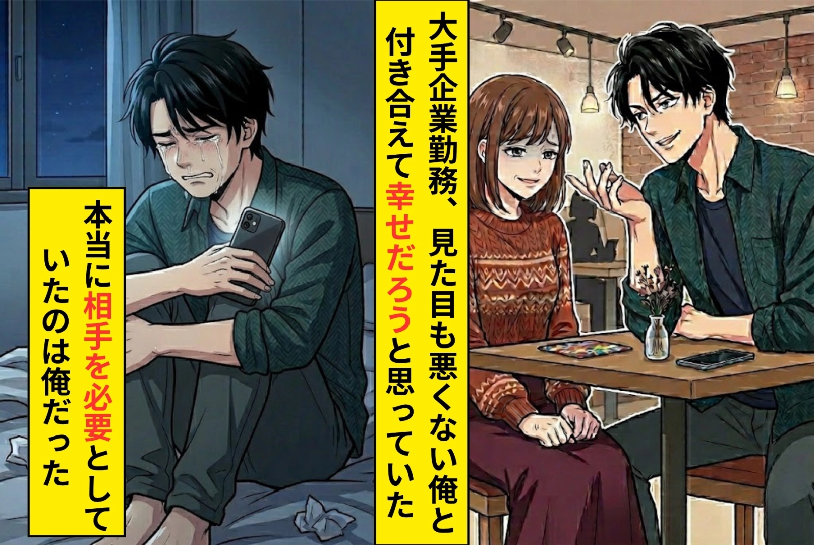 俺は自分に自信がありました。大手企業勤務、見た目も悪くない。彼女は俺と付き合えて幸せだろうと本気で思っていたのです。「俺以上の男はいないよ」と、口癖のように彼女に言っていました。彼女の意見なんて聞く必要はなかった。俺が決めれば上手くいく。そう思っていました。
