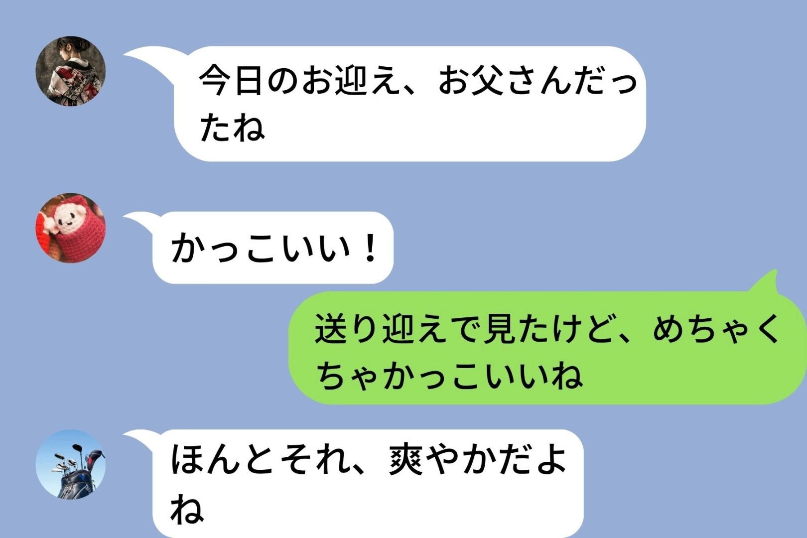 最初に書いたのは私ではありません。別のママ友が「今日のお迎え、お父さんだったね」と投稿し、そこから全員で「背が高い」「爽やかだった」と盛り上がりました。私も流れに乗って「送り迎えで見たけど、めちゃくちゃかっこいいね」と送りました。すぐに他のママ友が「ほんとそれ、爽やかだよね」とかぶせ、褒められた側のお母さんも「もう、やめてよ笑」と笑って返しました。全員参加の、ただの雑談でした。