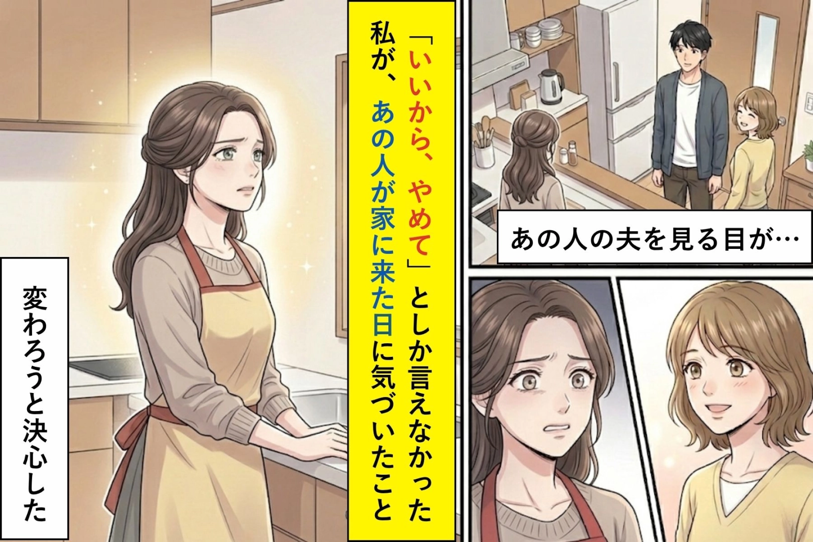 ただ、夫に向けられた彼女の目線が、どうしても頭から離れませんでした。夫に「なんで?あいつとは小学校からの付き合いだぞ」と言い返されても、「いいから、やめて」としか言えなかったのは、本当のことを言葉にする自信がなかったからです。