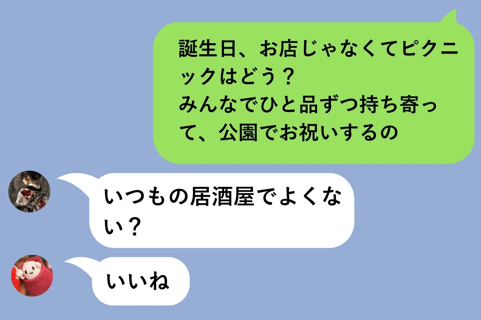 お祝いの方法を話し合う流れで、思い切って送りました。「誕生日、お店じゃなくてピクニックはどう? みんなでひと品ずつ持ち寄って、公園でお祝いするの」。
