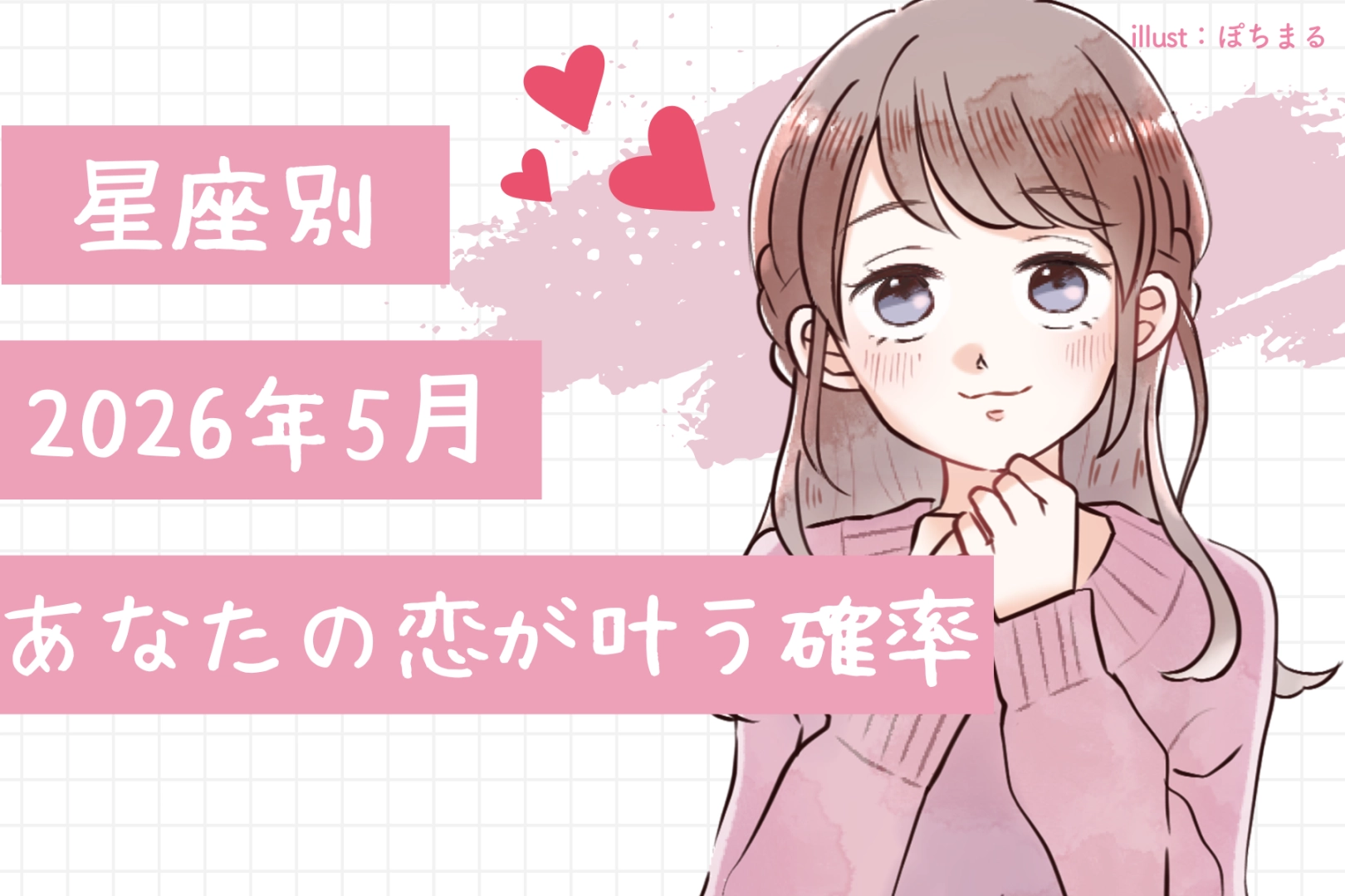 大好きな彼との距離が縮まる瞬間を、心待ちにしていませんか。2026年5月は、星々の配置があなたの恋心を後押ししてくれる特別な時期となりそうです。この記事では、あなたの星座ごとに恋が実る可能性をお伝えします。あなたの心に秘めた想いが、どれほど叶いやすい月になるのか、ぜひチェックしてみてくださいね。