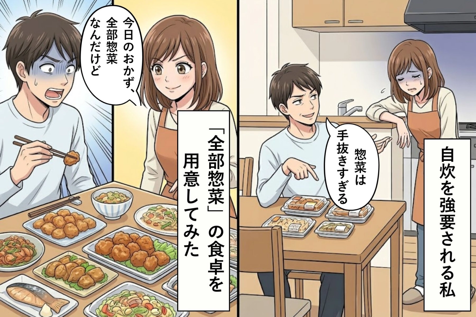 「惣菜は手抜きすぎる」共働きで自炊を強要してくる旦那→すべてのおかずを惣菜にしてみたら...